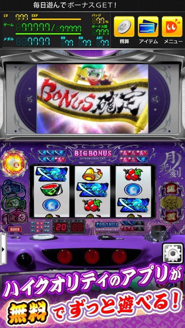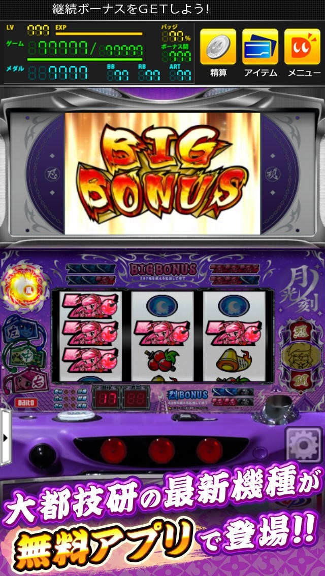 また、スロットアプリを面白く遊べる機能も充実。アイテムを使えば設定6で遊べたり、ART「月光ノ刻」で大量上乗せも可能!