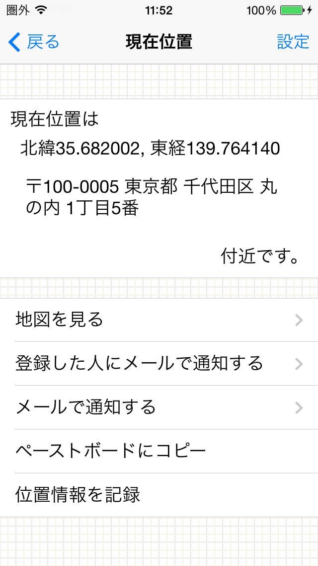 地図を見る・メールで知らせる・ペーストボードにコピーの3つの機能は、現在位置を表示する画面と同一ですが、メールの本文とペーストボードにコピーする文章は、現在位置ではないので「○○付近にいました。」のように少し文章が異なります。