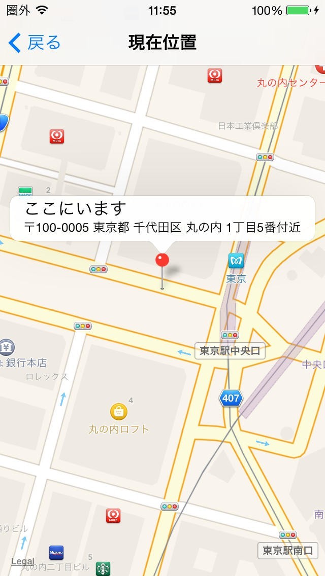 「地図を見る」をタップすると、現在位置にピンが立った状態の地図を表示します。
