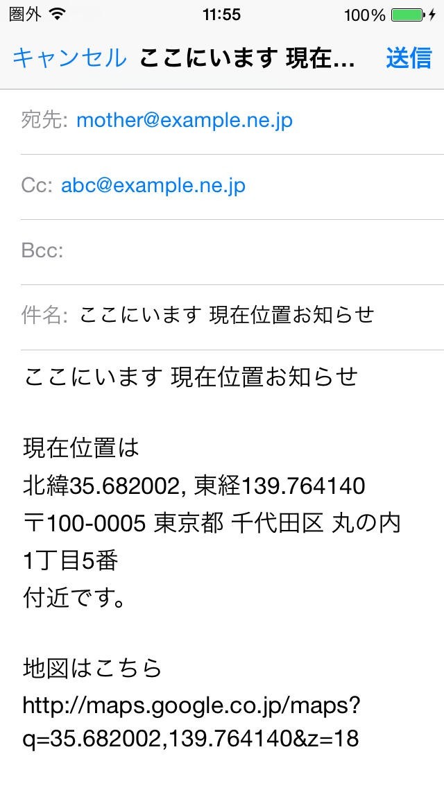 「メールで通知する」をタップすると、宛先が未設定の状態でメール送信画面を表示します。どちらもメールの本文に違いはありません。