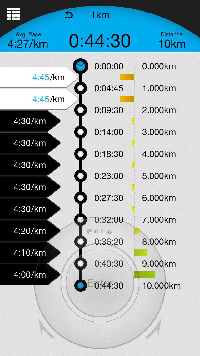 - 各区間のペースはダイヤルで個別に調整でき、ペースの推移やゴールタイムを計算可能