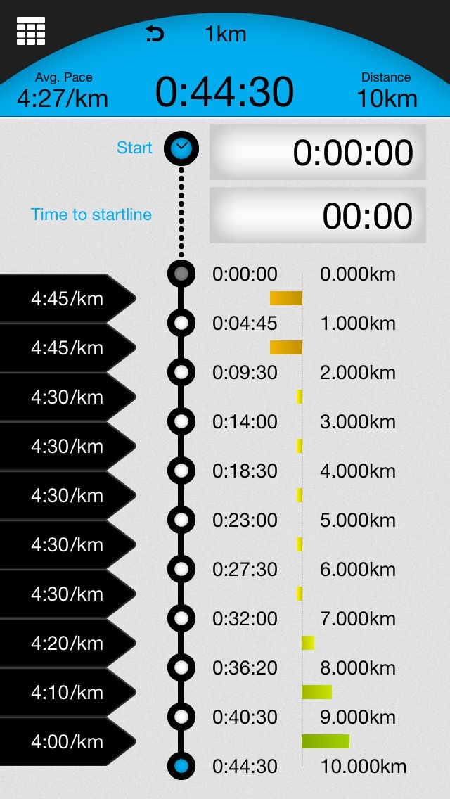 計算モードで入力した距離、タイム、ペースをもとに、1kmや5kmなど一定の距離で分けたスプリットタイムを自動的に計算して表示します。