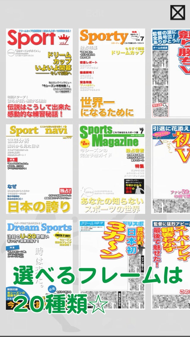 編集機能は写真にフレームを付け、スポーツ新聞の見出しのように出来上がる