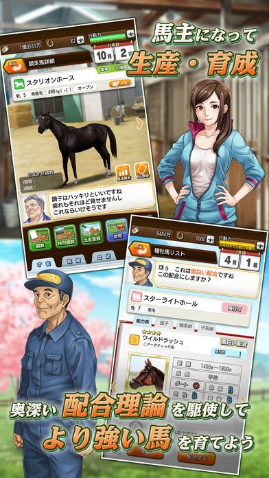 "ダービースタリオン"がアプリ化された、競馬シミュレーションPRG、レースに加え、種付け、調教など3つの機能を搭載