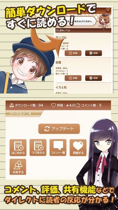 指一本でノベルゲームを直感的に作成、完成すれば即座に公開も出来ます。