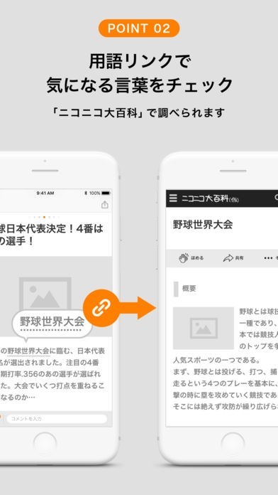 気になる用語があったときは、すぐにニコニコ大百科で用語の意味や解説を調べることができます。また、ニュースに投稿されたコメントも読むことができるので、みんなの感想も知ることができます。