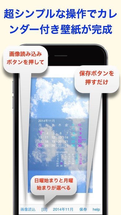 カレンダー付の壁紙をスマホのロック画面で使うためにつくりたいけど、難しそうなので困っているという人にぴったりなアプリがロックスクリーンカレンダーメーカーになります。このアプリなら画像読み込みボタンをタップしたら画像を選択して、日曜始まりか月曜始まりを選択、保存ボタンをタップするだけの簡単な操作でロック画面で使うカレンダー付壁紙を作ることができるようになっています。ヘルプ画面から壁紙用の画像をダウンロードすることが可能なサイトにアクセスすることもできるのスマホ内にいい写真がなくても壁紙づくりをスタートすることが出来るようになっています。