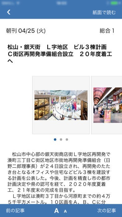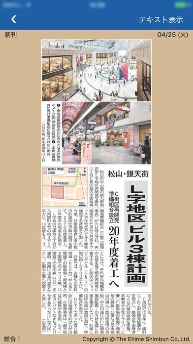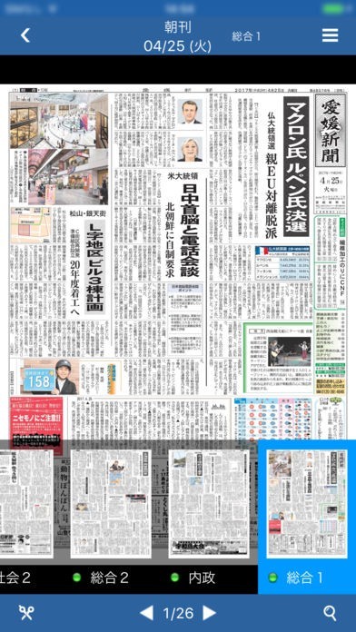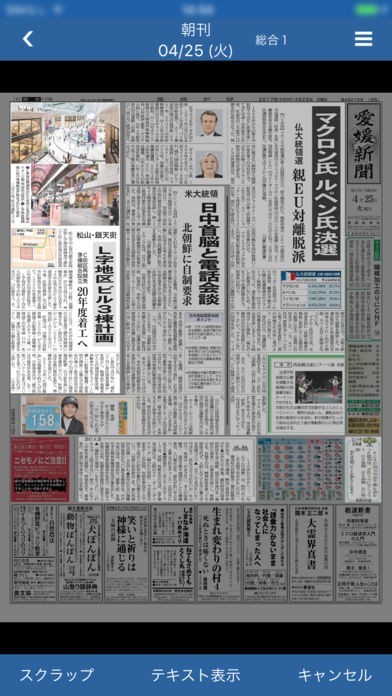 スマートフォンを使って片手で愛媛新聞を読むことができるアプリとなっていて、実際の紙面と同じようにスマートフォンの画面に表示させることができるようになっています。
