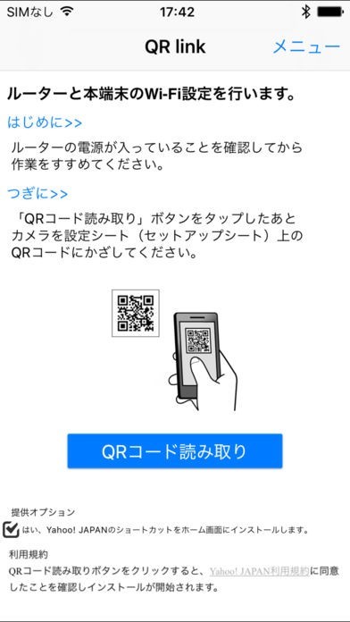 QRコード機能があり、ルータの電源を確認してからQRコードを読み取っていく