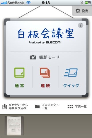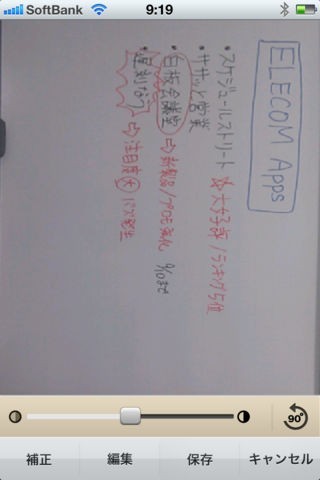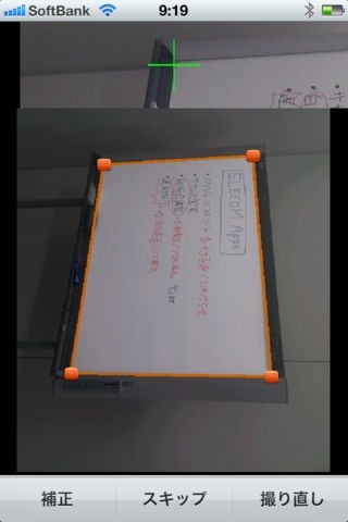 App Storeより引用「白板会議室」は、撮影したホワイトボードの写真内から、ホワイトボードの部分のみを自動的に認識し、台形補正を施すことが可能で、認識できない場合でも、拡大鏡を見ながらかんたんに取り込み枠の調整を行うことができます。コントラスト調整や回転も可能です。また、撮影した写真は議事録を含めたPDF形式でメールに添付、送信することが可能です。