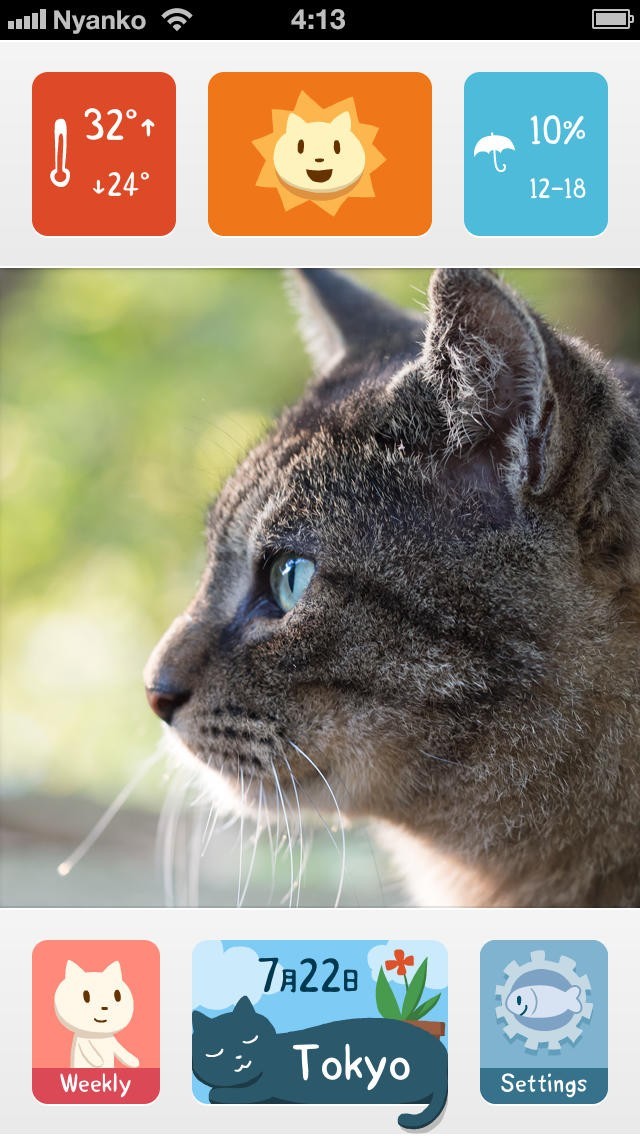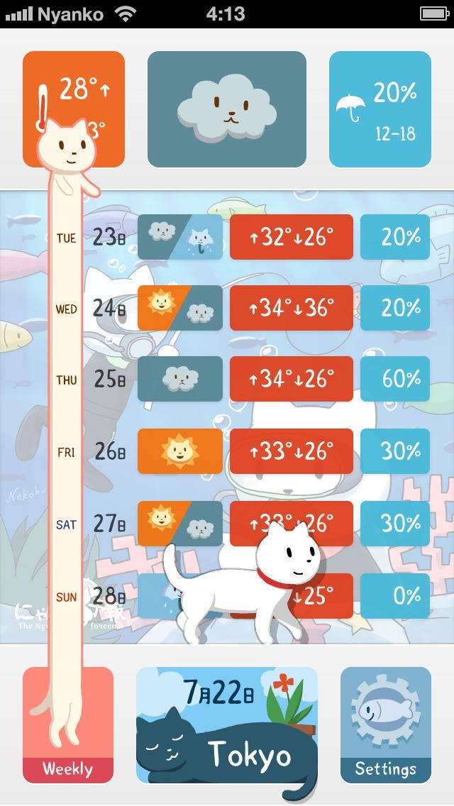 毎日の天気予報を猫が教えてくれるアプリです。にゃんこを引っ張って伸ばすと1週間分の天気を教えてくれます。より詳しい天気を知りたい時はにゃんこが歩いてくるのを待つと予報の詳細をテキストで教えてくれます。フォトフレームとしても使えます。自分の持っている写真ライブラリから好きな写真を壁紙に登録出来ます。季節ごとに変わるイラスト壁紙もあるので気分が変わります。日本全国から好きな地域を指定できるので最大5つの地域を登録出来ます。旅行で出かける時には便利な機能です。