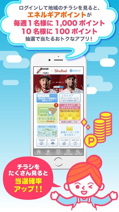 「ぐっとずっと。クラブ」へ自動ログインができ、ログインしてチラシを閲覧すると、エネルギアポイントが毎週抽選で当たるイベントにも参加できる、便利でおトクなアプリです!