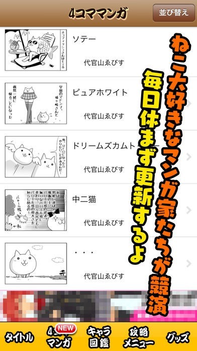このアプリでは2010年より配信スタートとなった携帯ゲームにゃんこ大戦争の4コママンガを読むことが可能です。 作家が描いた4コママンガを毎日1本配信、飽きずに読めるのが良い点です。 4コママンガは並び替えすることも可能、整理しやすくなっています。 ゲームで敵として登場するキャラクターの紹介、攻略方法の紹介、可愛いグッズの紹介もあります。 にゃんこ大戦争ファンの方は勿論のこと、4コママンガが好きな方、携帯ゲームが好きな方、猫が好きな方も楽しめます。