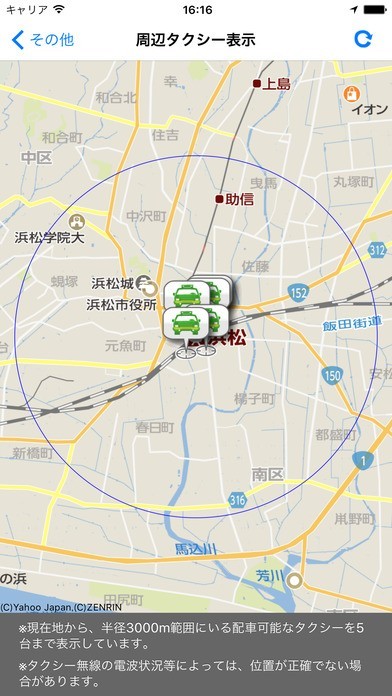 5.[その他] [周辺タクシー表示]機能を使って、現在地から半径3km以内にいるタクシー位置を把握することができます。