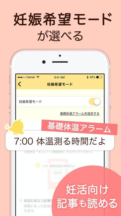 妊娠希望モードで基礎体温のアラーム設定などが可能!