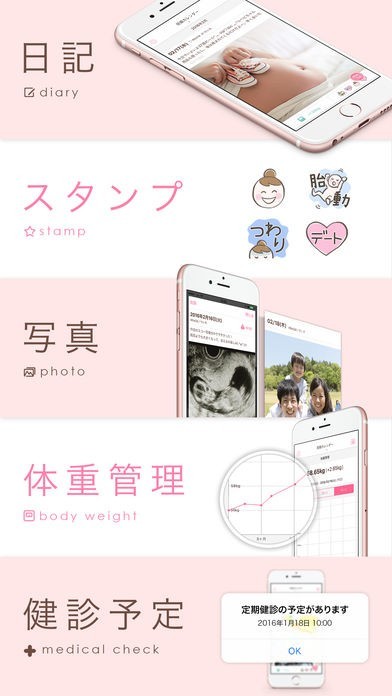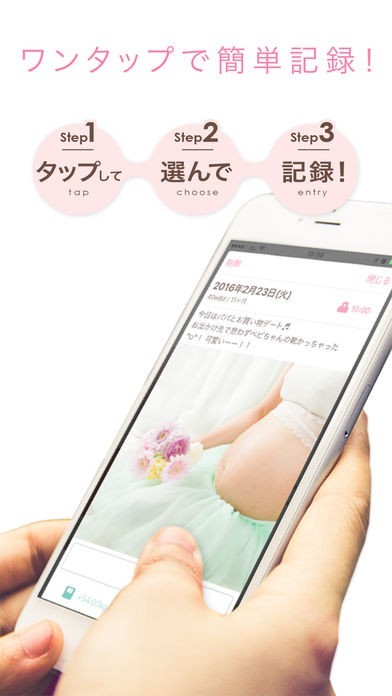 出産までの間の体調や、体重の増減、その日の日記を記録できるアプリ