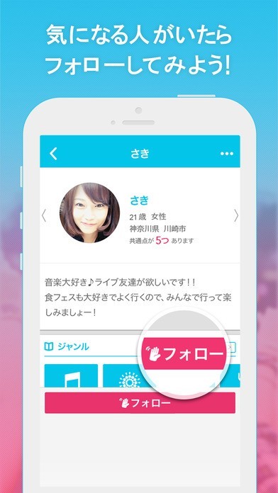 スポーツや音楽ライブなどのイベントに一緒に参加することができる仲間を探すことが可能なアプリとなっていて、気になる人にメッセージを送ってコンタクトをとることができます。