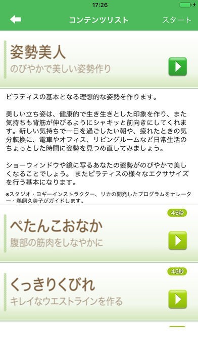 本LITE版では、5分でできるピラティスのうち、「姿勢美人」を5分間の音声でお楽しみいただける他、「ぺたんこおなか」「くっきりくびれ」「ヒップをアップ」「さよならタプタプ」の4作品を、45秒間の音声としてお届けします。