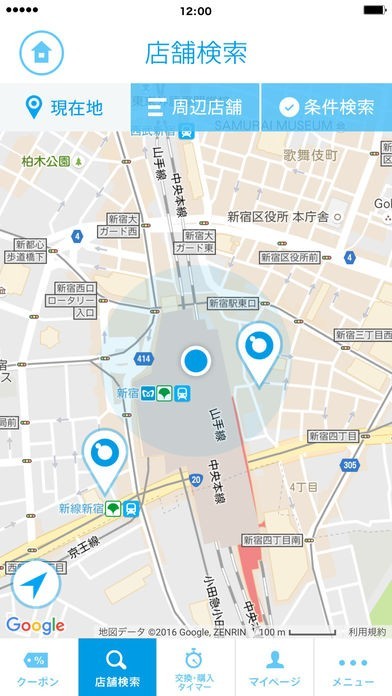 周辺のリアル店舗を探すことができます。GPSの利用により現在地を入力しなくても、近隣店舗の位置を把握できるのが特徴的です。また場所把握だけではなく、公共交通機関での移動時間も同時に表示できます。