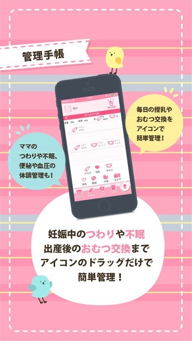 毎日の授乳やおむつ交換等これまでは眠い目をこすりながら夜中でも手帳に書き込んでいたものをアイコンのドラッグだけで簡単に管理することが出来ます。