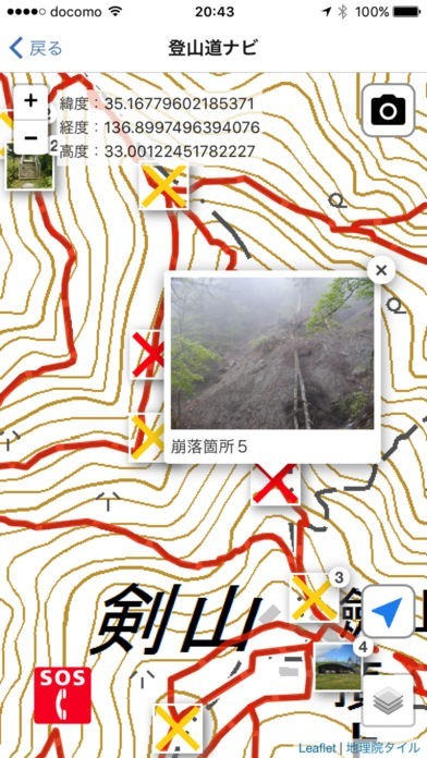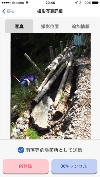 登山中に発見した崩落箇所をカメラ機能を利用して撮影する事で、写真、撮影位置、コメントを管理者へ報告する事が可能です。