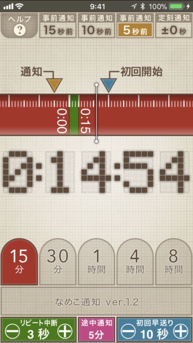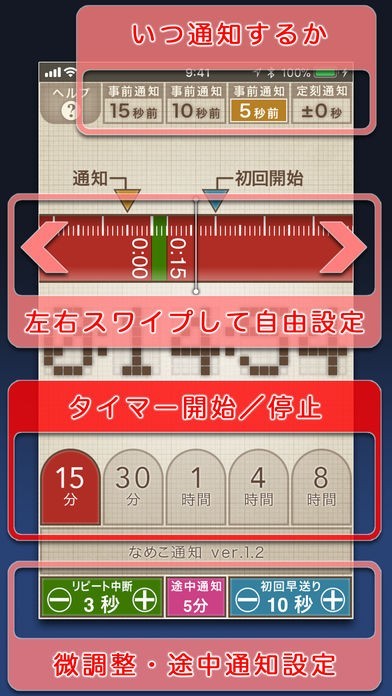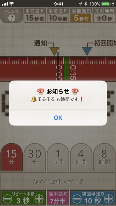 - 事前通知するタイミングを設定できます : ±0秒、5秒前、10秒前、15秒前