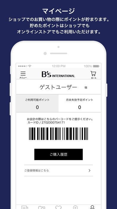 スマホ画面に表示されるバーコードを店舗での買い物の際に提示するとポイントを貯められるのでポイントカード代わりに使えます。ポイントは店舗でもオンラインストアでも共通で使用できます。