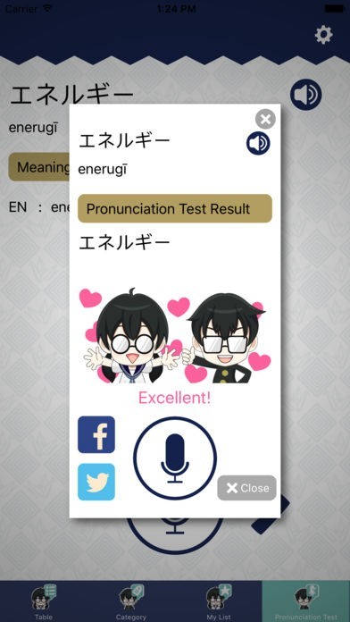 - Pronunciation audio can be chosen from the voice of a girl, or the voice of a boy. You can listen to the pronunciation from the voice of each cute character. Unlike mechanical voices, it is fun to listen to!