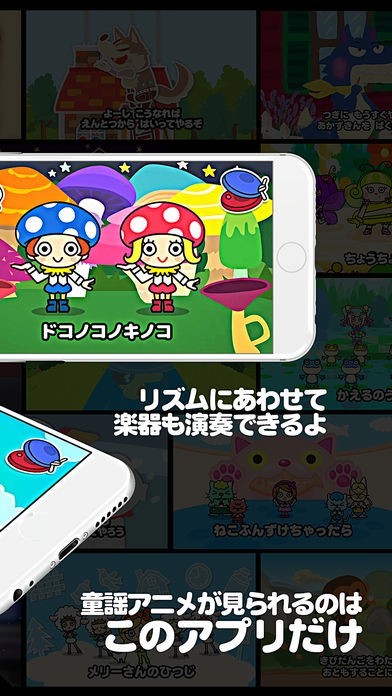 リズムに合わせて楽器遊びができ、童謡アニメも見れる