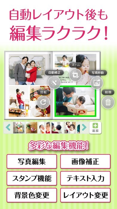 自動レイアウト後の編集、レイアウト変更、画像修正も可能。自分好みに編集できる