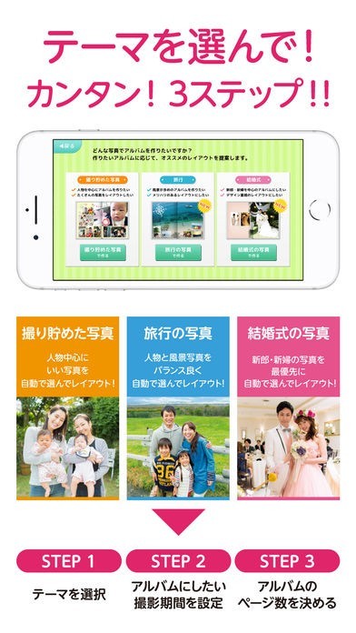 スマートフォンの写真をページ数とテーマを選択するだけで簡単にフォトブックにすることができる!