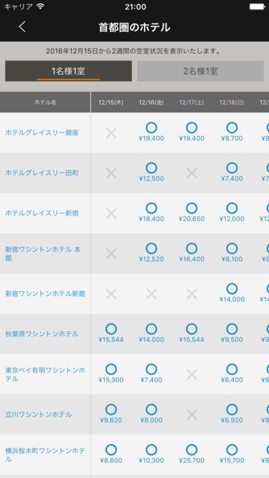 泊まりたいエリアを選ぶことで、エリア内にあるホテルの2週間先までの空室状況を閲覧できるので、簡単に泊まれるホテルを見つけることができ、そのまま予約することも可能です。