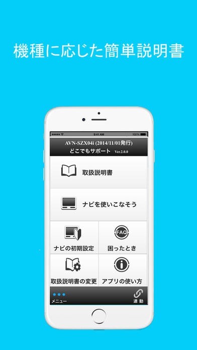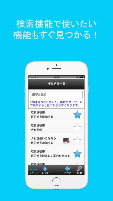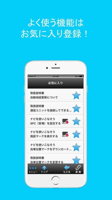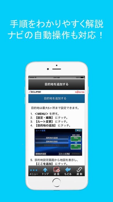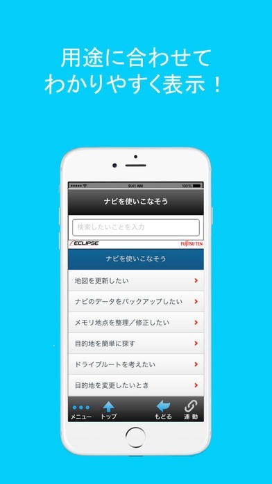 このアプリは社内搭載されているカーナビと連携することによって様々な操作方法を確認することが出来ます。 まずは、取扱説明書を読むことが出来るので、使い方に迷ったらスマートフォンでいろいろと調べることが出来るので、より操作性がよく素早く閲覧することができます。 また、用途ごとに詳細な操作説明が行われているので、それを参考にすれば今まで知らなかった機能も自在に使いこなせるようになることでしょう。 他にもキーワード検索によって、直接的に調べたいことを探し出すことも出来ます。 そして、どうすればいいのかわかったならば操作画面まで連動して導いてくれるのであとは指示通りに動かスだけです。