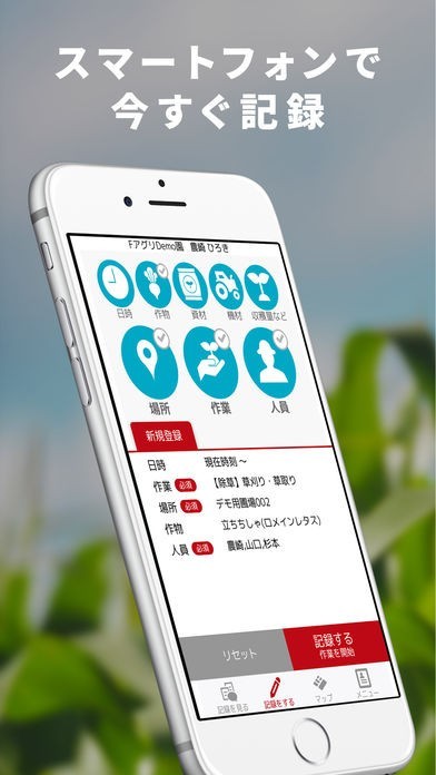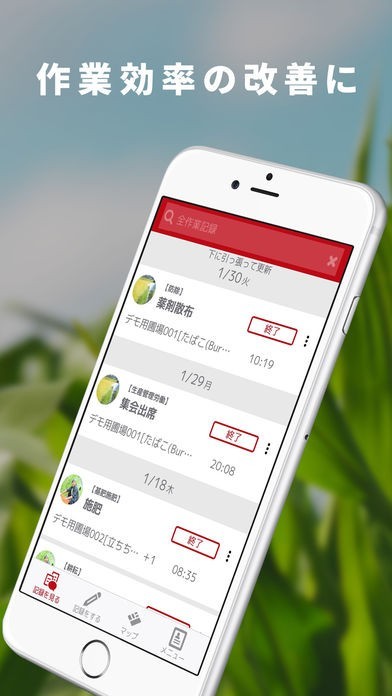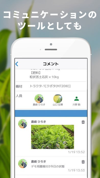 アプリのシェア機能を使えば、写真やコメントを仲間とシェアすることができます。作業記録に圃場の写真をアップしたり、指示やアドバイスをコメントしましょう。仕事の効率化や質の向上に役立つ機能です。