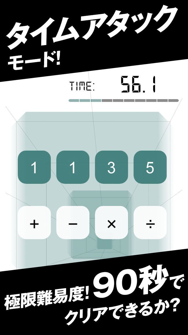 次々に4つの数字が現れるので、四則演算で10にする、というシンプルなパズルです。問題量はたっぷり500問以上で、90秒モードもあるので、暗算力強化にも暇潰しにも使えます。