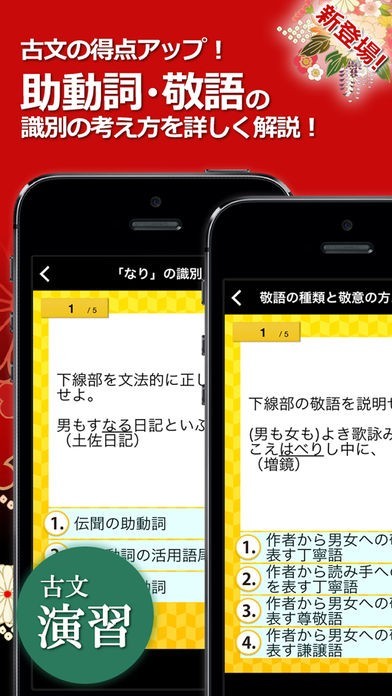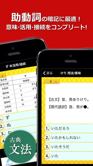 古文と漢文は中高の学生たちを悩ませる科目の一つです。日常会話や文章の常用語とは異なるため、助動詞や用言の活用形など意識して勉強しなければ覚えることはできません。参考書を携帯してみるのも手段となりますが、持ち運びに便利なアプリ版を活用することで学習の機会を増やすことが可能です。古文・漢文(古文単語、古典文法、漢文)は、演習までがセットとなっていますので、あれこれと別アプリや参考書を増やすことなく纏まりのある学習が実現します。正解を番号で答えるお手軽な設計となっていますが、3段階の古文単語や訓読の漢文と暗記用まとめページのように、実力に合わせてステップアップできる点も魅力です。