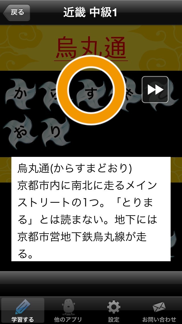 日本国内の読み方が難しい地名について、正しい読みをひらがなが書かれた複数の種類の手裏剣を動かして回答するという形式になっており、楽しみながら学ぶことができます。