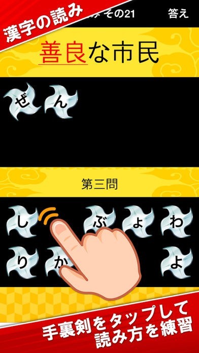 小学生に向けた漢字検定10級から5級までの問題が入っています。読み取り試験では、手裏剣になった文字をタップして答える仕組みになっているので子供にも分かりやすくなっています。