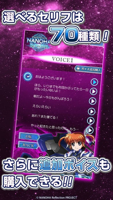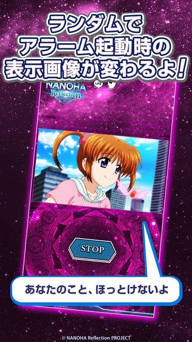 魔法少女リリカルなのはReflection なのはアラームは同名のアニメ作品主人公の高町なのはの声で起こしてくれるアプリで、録り下ろしの70種類のボイスから3つを選択してアラームにできます。