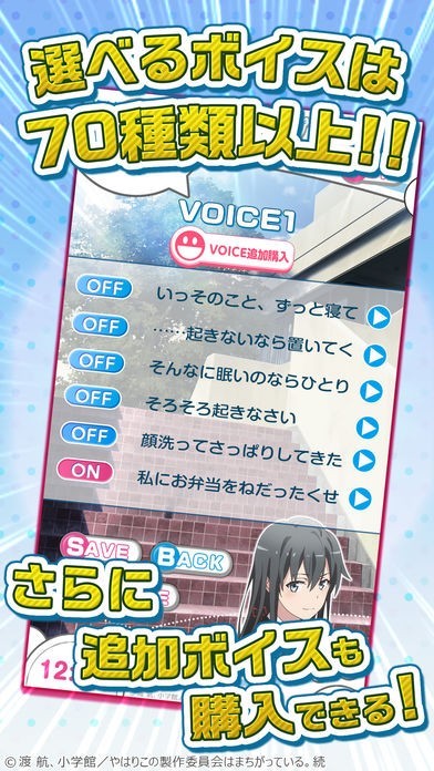 アニメやはり俺の青春ラブコメはまちがっている。続の雪乃の声による目覚まし時計アプリで、声を70種類から選ぶのが楽しいです。