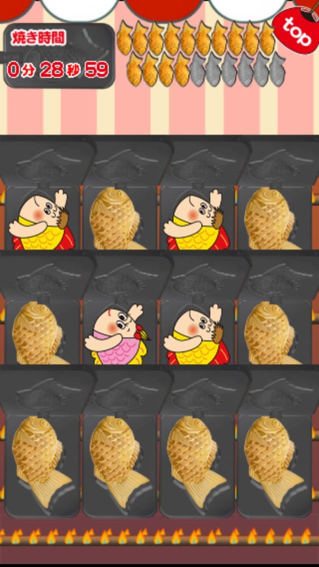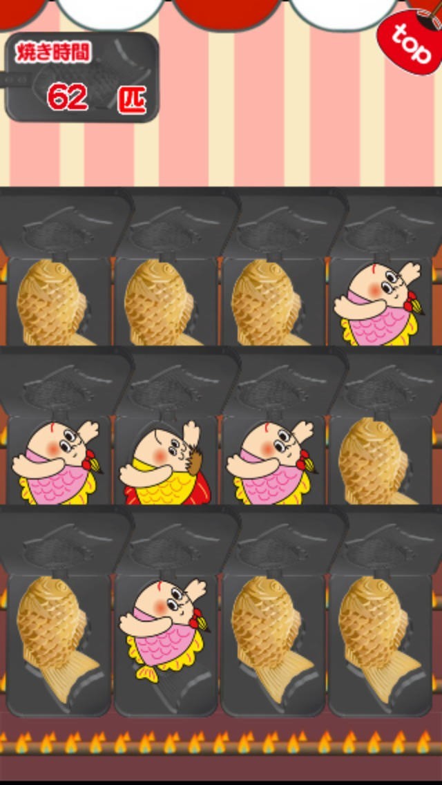 鉄板に隠れた「たいやきくん」をさがしタイムを競うゲームです。3匹のたいやきくんが鉄板に隠れているので、隠れた鉄板をタッチして「たいやきくん」をさがし当てます。鉄板は20回入れ替わるので、スピードを落とさすにどんどんさがし当てて行こう!