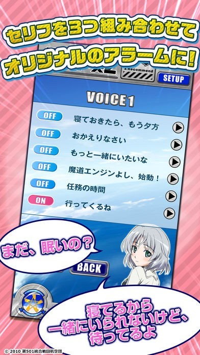 ストライクウィッチーズアラーム 〜サーニャ編〜は100種類のボイスから3つ組み合わせてアラームとできるものなので、組み合わせが非常に多く、まずはいろいろなボイスで起こしてもらってお気に入りを見つけるのがおすすめです。