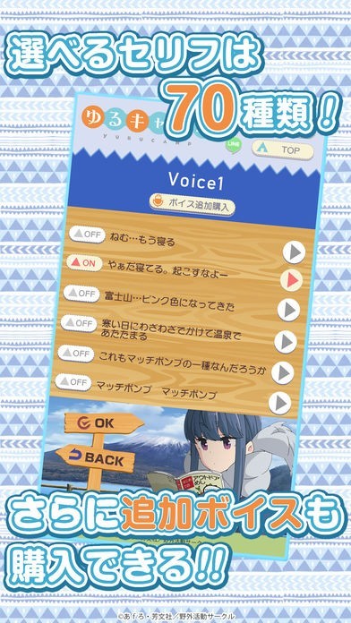 ゆるキャン△ ~志摩リンアラーム~は70種類のボイスから3種類を選んでアラームにできるため、好きな組み合わせを見つけるまで色々なボイスを試してみるのがおすすめです。追加購入ボイスも用意されています。