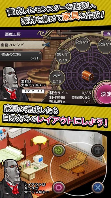 App Storeより引用プレイヤーは「転生悪魔」となり、配下の美少女モンスターと共に自分たちの悪魔の巣を豪華に育てていくのがこのゲームの目的です。