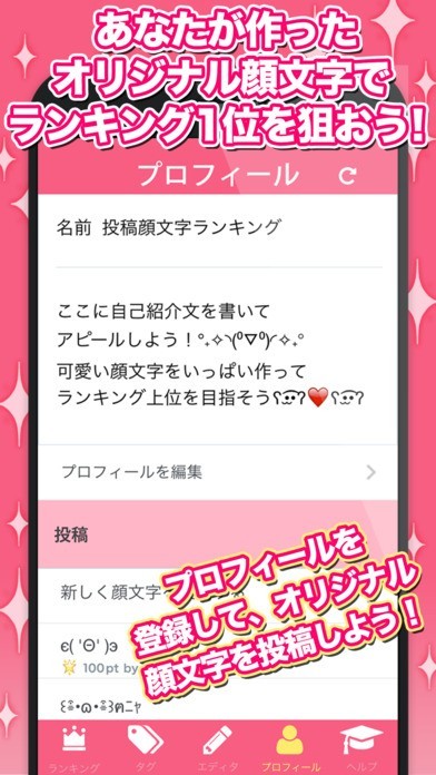 プロフィール登録して自分で作った顔文字を投稿することが出来る