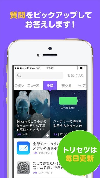 iPhoneの小技や裏技情報が沢山載っている便利アプリです。iPhoneビギナーの方からiPhoneを使っている方まで「こんな機能があったんだ!」とビックリする便利な裏技や機能を紹介しています。また、今トレンドのアプリや今更聞くのは恥ずかしいiPhoneの質問をピックアップして紹介したりなどiPhoneを持っているなら知っておくととっても便利な機能を紹介しています。