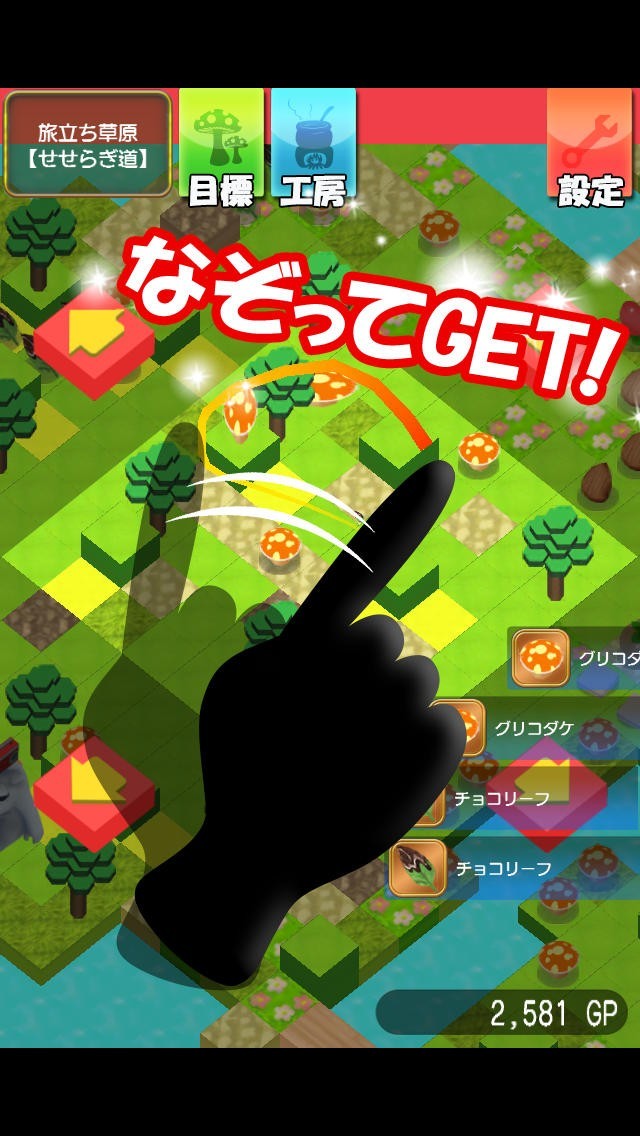 不思議な世界の変わったキャラクターたちにグリコの製品のすばらしさを伝える独創的なゲームアプリが「グリコのぐりぐりワンダーランド」です。ステージのあちこちに落ちている素材をフリック操作で収集することで60種類以上のグリコ製品を作成することができるようになっていて、作ったグリコ製品を動物などのキャラクターたちにあげることで仲良くなったり、ハッピーな気持ちにしてあげることができます。完成したグリコ製品は図鑑に収録されて後から確認できます。