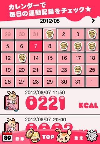 一日ごとの消費カロリーも確認可能。可愛いキャラクターと一緒にダイエットに挑戦しよう!