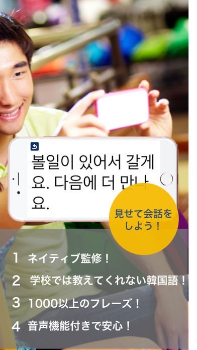 文法を知らなくても、『自動音声読み上げ機能』や、『全画面表示機能』を使って手軽に異性と韓国語会話を楽しむことができます。