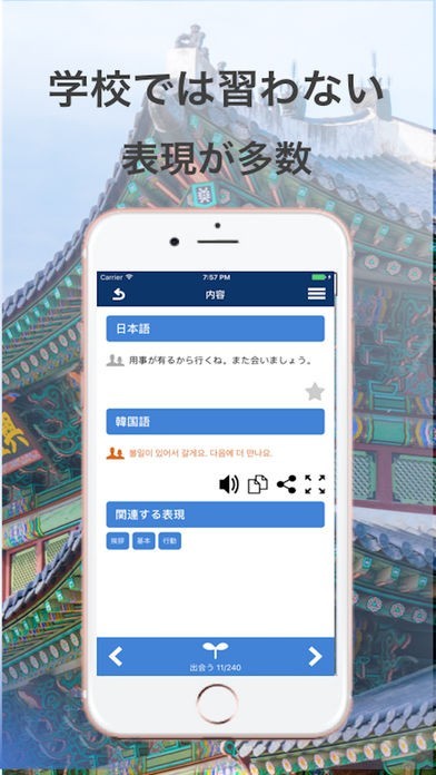 本アプリは「出会い」・「仲良くなる」・「色々な誘い」・「付き合う・結婚する」・「トラブル」と出会ったばかりの関係から親密になる流れを踏まえて開発されております。学校では絶対に教えてくれない本当に使える表現をお楽しみください